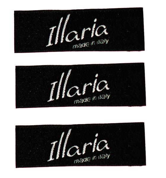 Жаккардовая бирка с логотипом Illaria. 18х65мм (7.5+50+7.5)мм, с подгибом с двух сторон. Фон черный, логотип белый.